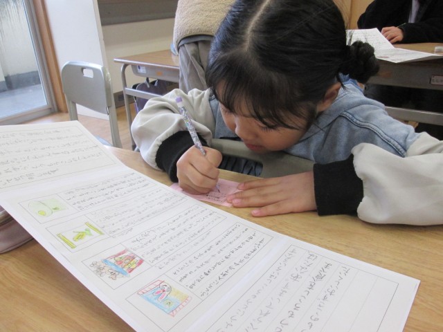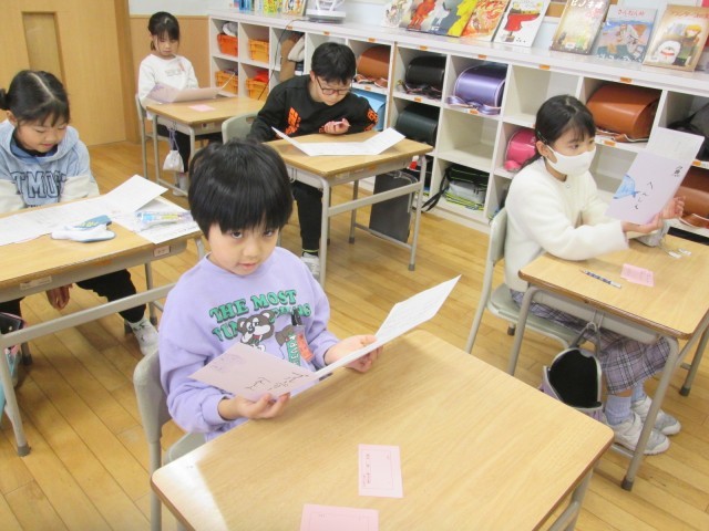 国語では、「すがたをかえる大豆」の学習を生かして、自分が選んだ食品のへんしんブックを作りました。今日は、友達のへんしんブックを読んでよさを伝え合いました。食品を紹介する順序の工夫や、くわしく書かれた文章のよさに気付きました。