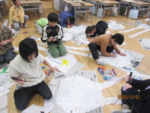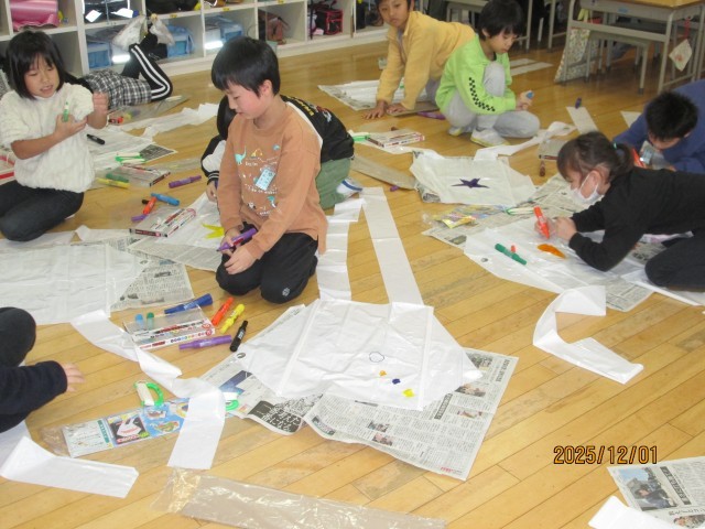 あすのたこあげに向けて、たこに絵やもようをかきました。思い思いの夢をのせて、楽しいイラストがかけていました。明日が楽しみです。