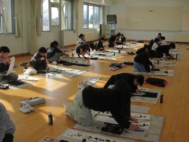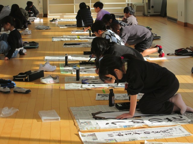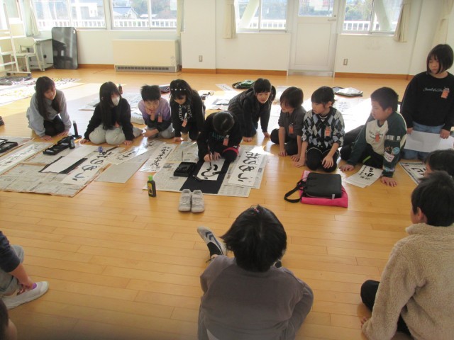 書写の時間に、書初の練習を行いました。得意な友達の手本を見せてもらい、床で書くコツを学びました。初めて床で書いたので、今日は思うように書けなかった子が多かったようです。練習を重ねていきます。