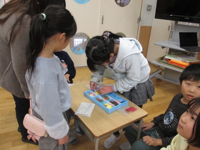 外国語活動では、グリーティングカードづくりに挑戦しています。今日はカードに貼るためのいろいろな形パーツを、お店屋さんの形でやりとりしました。’What do you want?' 'A big red triangle,please.'と、欲しい形や色、大きさを尋ねたり伝えたりしました。正しく伝えようとがんばっていました。