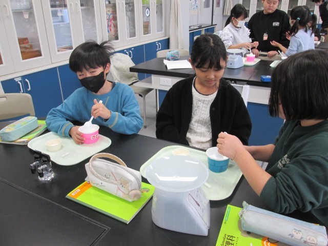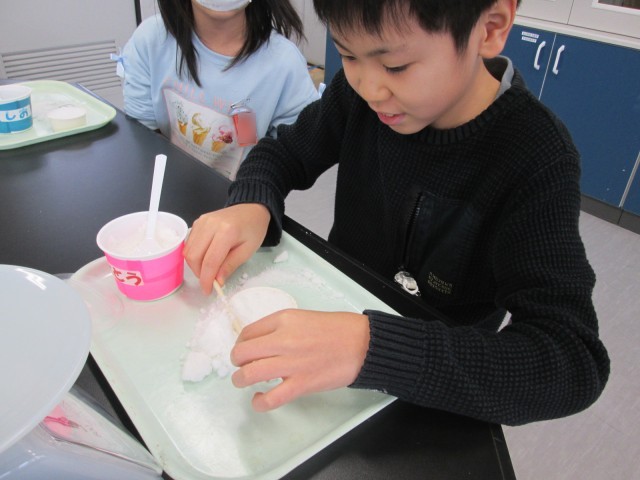 理科では、同じ体積の塩と砂糖の重さを比べました。正しく比べるために、塩や砂糖を同じ大きさのカップに入れてすり切りをしました。見た目は似ているのに重さが違っていることがわかりました。小麦粉や片栗粉なども調べてみたいと振り返っていました。