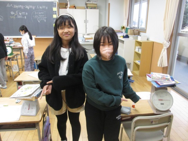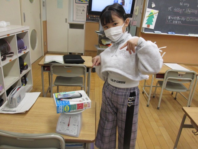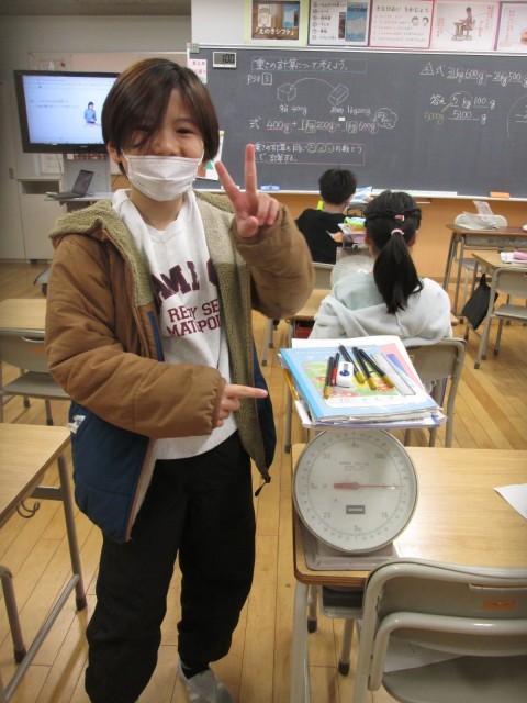 算数では、はかりの読み方を学習しました。今日は、一人一台のはかりを使って、1kgぴったりをつくりました。あと少し足りない時には、1円玉で調整しました。水筒の重さが1kgになるように、お茶を飲んで減らしている子もいました。「あと200gくらいだから、給食の牛乳1本分くらい飲めばいいかも」と、引き算の考え方を使っていました。