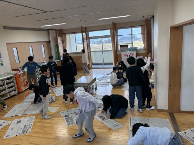 5年生 書き初め練習に向けて 公開日 2025/12/15 更新日 2025/12/15 5年生 書き初め練習に向けて、下に敷く用と書いたものを保存しておく用の新聞紙を繋げました。新聞紙に遊ばれる5年生でした。