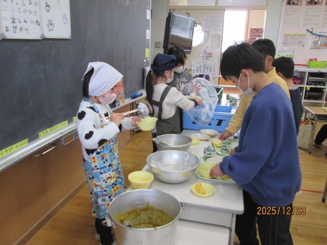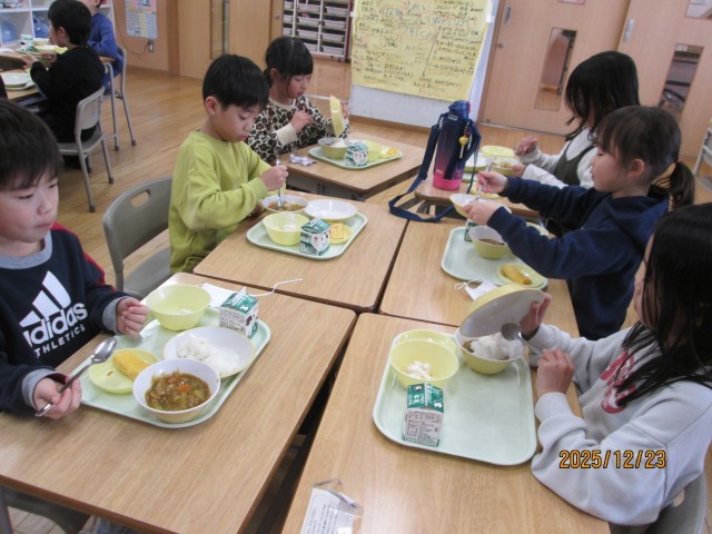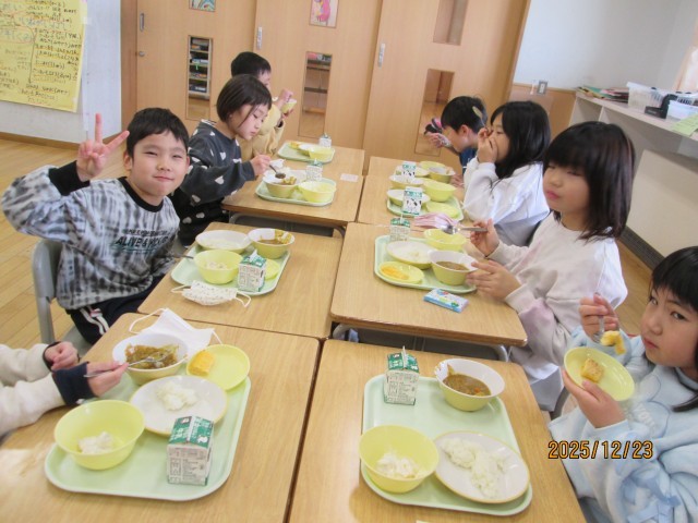 2学期最後の給食の時間です。今日の献立は、子供たちの大好きなカレーライスとフルーツヨーグルトでした。あっと、いう間に食べ終わり、大満足でした。おいしかった!!