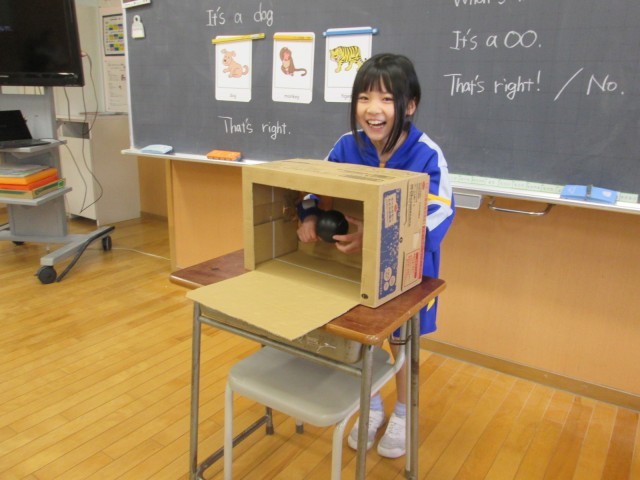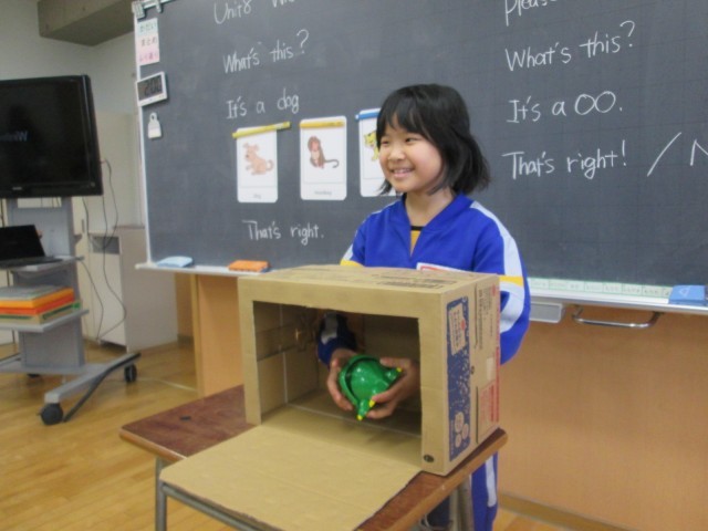外国語活動では、What's this?の表現を使って、箱の中身を当てるクイズを楽しみました。英語でヒントを出すのは難しかったですが、ALTの先生の力を借りながらヒントを出すことができました。