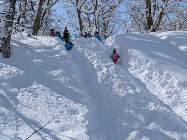 「しりすべり」の様子です。自分たちで踏みしめた雪の上で元気よく楽しんでいます。