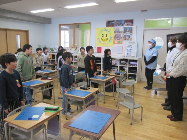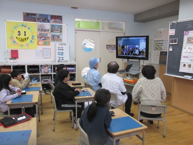 今週の給食週間に合わせ、三年生では栄養職員の先生、調理員さんにビデオレターを作成していました。今日は、3年生教室に出向いてくださり、一緒にビデオレターを見たり、感謝を伝えたりしました。2学期後半から食べキリンができるようになってきたことを褒めていただき、嬉しそうな子供たちでした。
