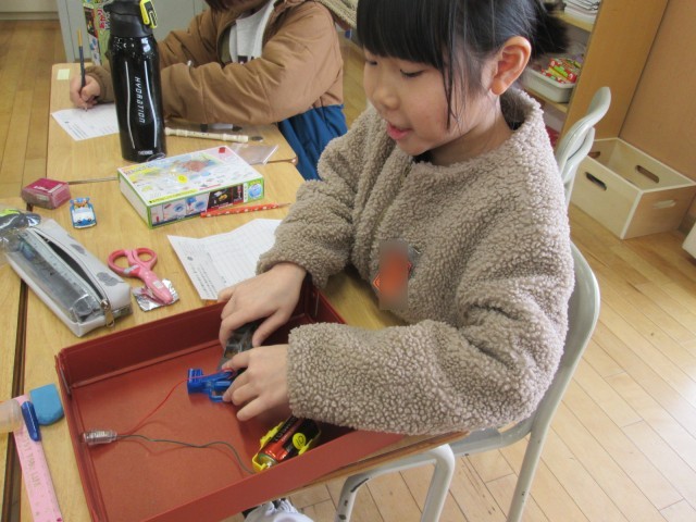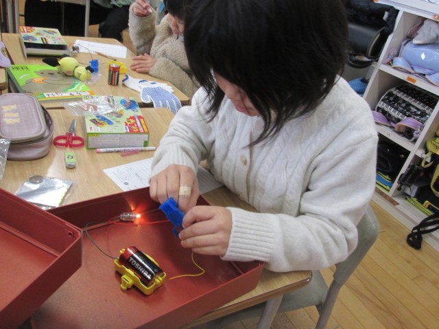 理科では、電気が通るものを調べました。身の回りにあるものに導線を当てて回路を作り、豆電球が光るか確かめました。はさみでも、通るものと通らないものがあり、新しい疑問がわいてきた子供たちでした。