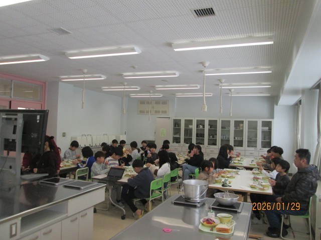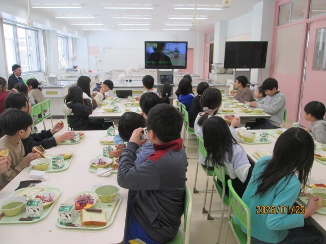 なかよし会食 白団 公開日 2026/01/29 更新日 2026/01/29 学校の様子 白団は、家庭科室で会食をしました。食事の合間に、5年生が作った給食用の動画を見ました。楽しい動画に、くいいるようにみている子供たちです。
