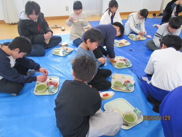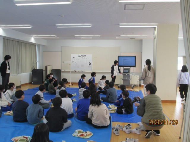 黄団は、太田っ子ルームで会食をしました。普段、食事をすることがあまりない広い場所でのびのびと給食を食べました。この日のメニューは図工にちなんだもので、チョコペンが出ました。子供たちは、食パンに思い思いに絵を描いていました。