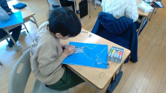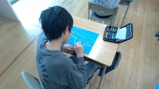 図工では版画を彫刻刀で彫り進めています。安全に気を付けながら集中して活動しています。
