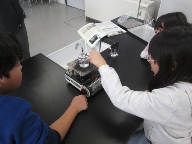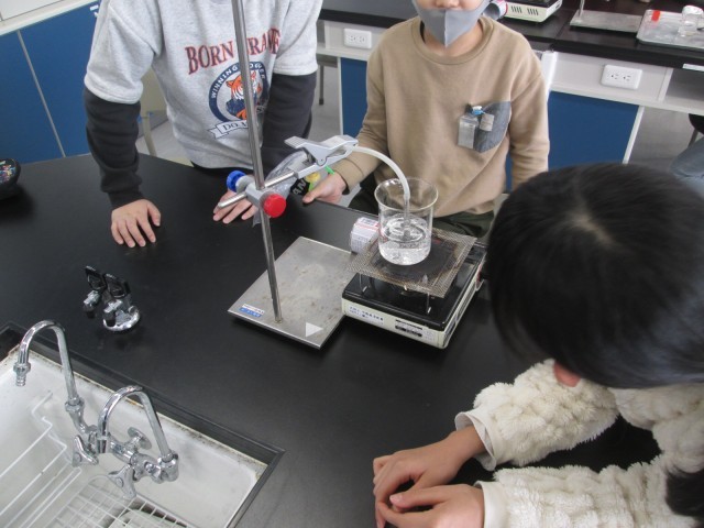 あわは予想の段階で水派と空気派に半々で分かれていました。あわを集めると水が溜まっていく様子を見て子供たちは「やっぱり水蒸気だった!」「予想と違って水が溜まってきた」と楽しそうに実験をしていました。
