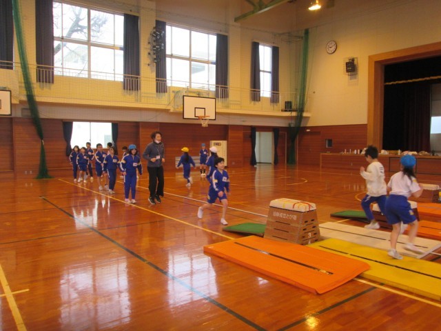 開脚跳びや台上前転に慣れてきた子供たちは、抱え込み跳びにもチャレンジしました。みんなで連続で跳んでみたり、縦と横をクロスして跳んだりして楽しみました。