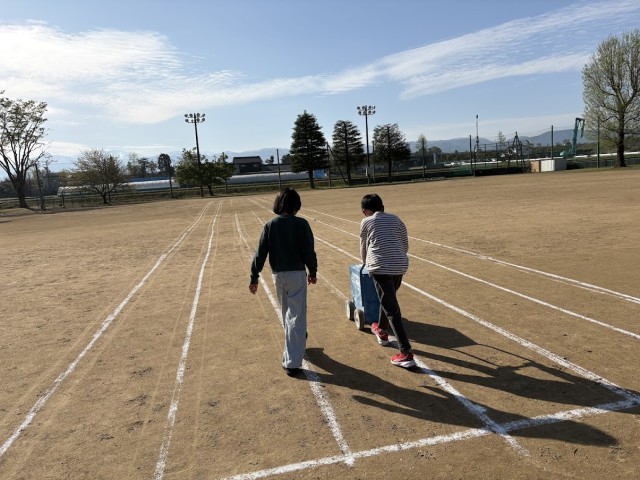 登校後、みんなが走りやすいように白線を引く6年生の姿がありました。