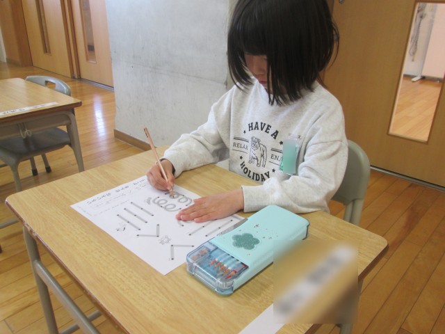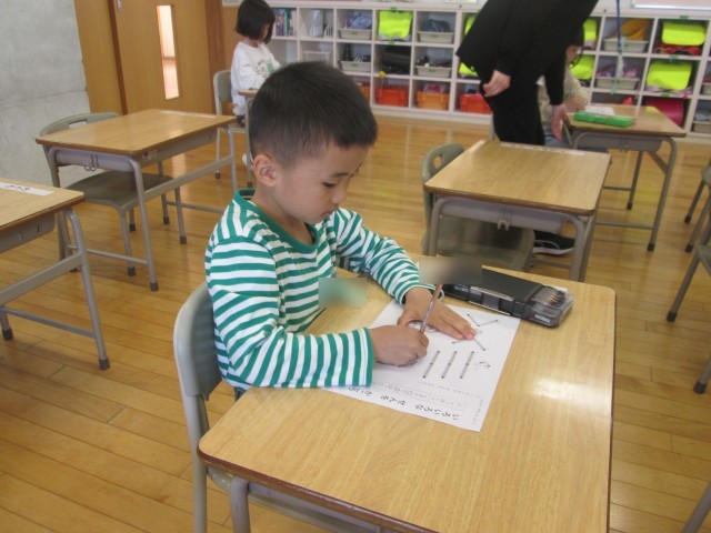 書写では、鉛筆の持ち方や字を書く時の姿勢を学び、実際にいろいろな線を書いて楽しみました。
