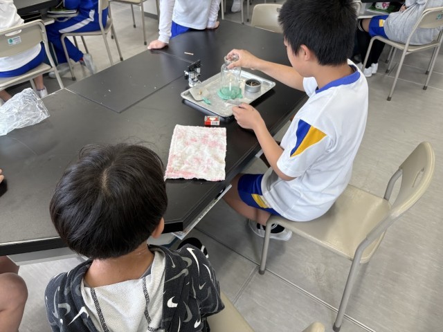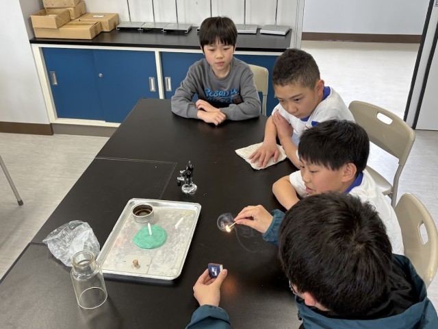 理科では、さっそく実験をしました。空気の通り道の有無によって、ろうそくの火が消えるのかどうかを試しました。初めてマッチを扱う子どももおり、火は上に向かってくることを感じているようでした。