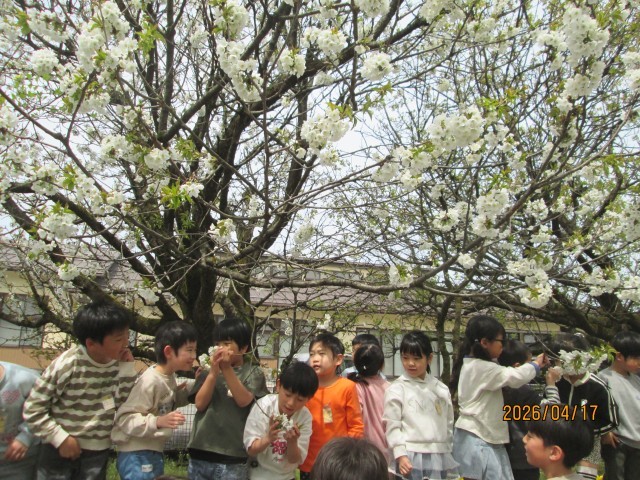 白っぽい桜の花を見つけました。さっそく、外にでて桜の観察をしたり、写真を撮ったりしました。お天気もよく、いい気持になりました。