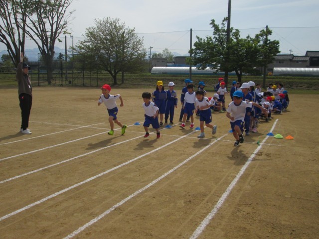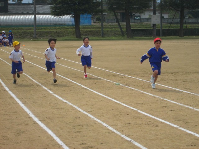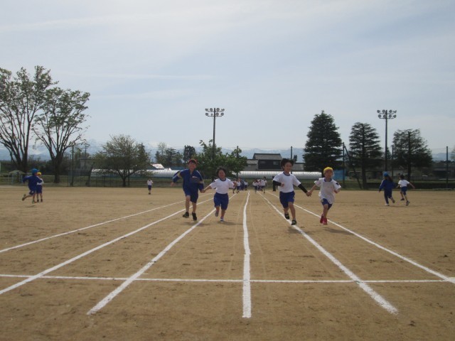 今日の体育も2年生と一緒に活動しました。かけっこをして、タイムを測定しました。2年生さんが横で伴奏してくれたので、まっすぐに最後まで走り切ることができました。