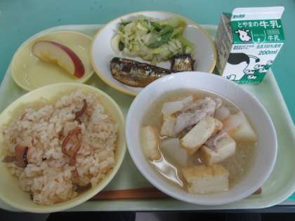 本日の献立は、きのこごはん、いわしの梅煮、野菜ソテー、豚汁、りんごです。