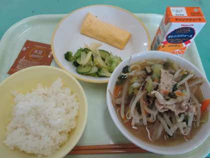 給食の時間に教室を回っていると、3年生の女の子から「今日の給食には大豆が2種類入っているね」と言われました。ひとつは“大豆ふりかけ”、もうひとつは“とんこつラーメン”に入っている“もやし”だそうです。最近授業で大豆について勉強したようで、給食にも活かされた場面でした。