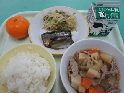 本日の献立は、豚肉とじゃがいものうま煮、さんまの土佐煮、ビーフンソテー、みかんです。