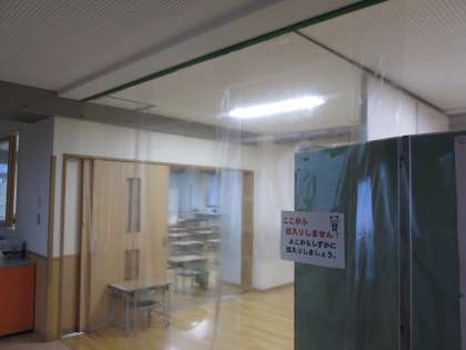 ぐっと寒さが増してきて、学校では暖房を入れ始めました。しかし、ここで頭を悩ませているのが、換気・ソーシャルディスタンスを保ちながらの暖房です。換気は忘れることがないように全校放送を入れるなどして対応していますが、多目的室まで広がっている座席が問題でした。そこで、教職員で知恵を出し合ってできあがったのが写真のフィルムです。両端に出入りするスペースをつくるなど、子供たちの学校生活に合わせて改善していこうと考えています。
