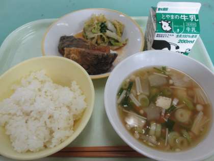 今日の献立は、ごはん、牛乳、魚の梅風味蒲焼き、ごまあえ、すいとん です。