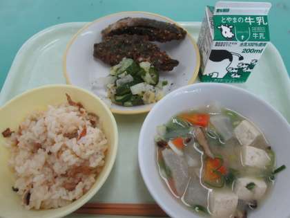 本日の献立は、魚の磯辺揚げ、ゆかり和え、みそけんちん汁です。