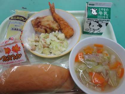 10日(木)の給食 公開日 2020/12/10 更新日 2020/12/10 給食室 本日の献立は、(豚肉のフリッター、えびフライ)、ひよこ豆のサラダ、野菜スープ、(メープルマフィン、エクレア)です。 ※( )は選択献立