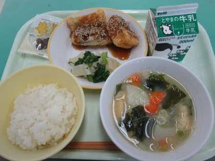 今日も雪が降り続き、とても寒い一日でした。“具だくさん汁”はにんじん、玉ねぎ、じゃがいもなど、たくさんの食材が入っています。温かいみそ汁は身体を内側から温めてくれる効果があります。