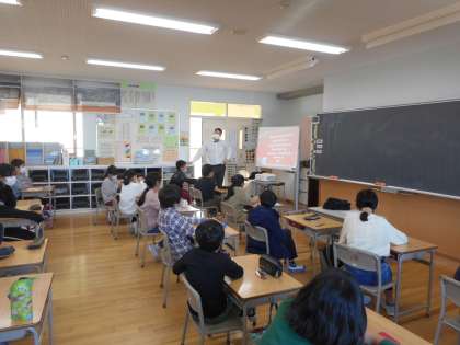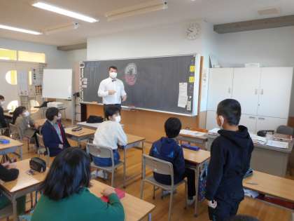 12月17日(木曜日)、外国語の時間にグレッグ先生とクリスマスに関係する物を当てるゲームをしたり、クリスマスソングを歌ったりして、外国語に親しみました。写真のイラストは何でしょうか?○○ボールではありませんよ。