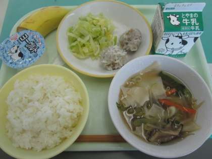 本日の献立は、ゆでキャベツ、ワンタンスープ、もち※シューマイ、ヨーグルト、バナナです。