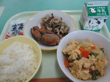 今日の献立は、ごはん、牛乳、ふくらぎの照り焼き、れんこんの香り炒め、厚揚げの卵とじ、味付け小魚 です。