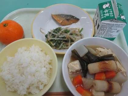 本日の献立は、さむらいのおでん、さばのみそ煮、ごまあえ、みかんです。