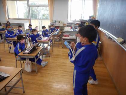 わらべうたを楽しんだよ(2年生) 公開日 2021/01/28 更新日 2021/01/28 2年生 1月26日(火)3時間目、音楽科でわらべうた「なべなべそこぬけ」の学習をしました。 伴奏づくりでは、それぞれがつくった伴奏と歌と拍の手拍子を重ねて楽しみました。 わらべうたに親しむことができました。