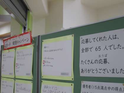 来週の「雪っこ遠足」に向けた大きな荷物をもった子がたくさんいた 28日(木)の朝です。昨日、一昨日と、栄養職員・調理員への感謝の手紙を給食時間に放送していました。右の写真は、保健委員会で行った「健康クイズ」の結果発表です。お子さんは、何問正解したでしょうか?