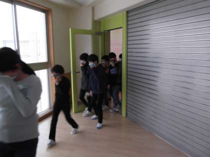 安全の日の今日は、火災を想定した避難訓練を行いました。本来、火災の場合は防火シャッターが自動に閉まります。子供たちは狭い非常扉を開いて通らなければなりません。より、実際に近い形で訓練を行いました。