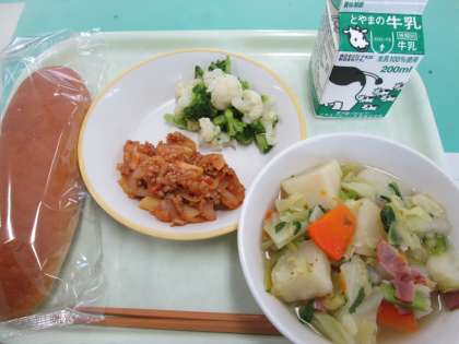本日の献立は、ペンネのミートソース、そえ野菜、ポトフです。