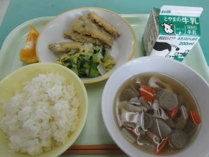 今日の献立は、ごはん、牛乳、小いわしの天ぷら、昆布和え、こんこん汁、いよかん です。