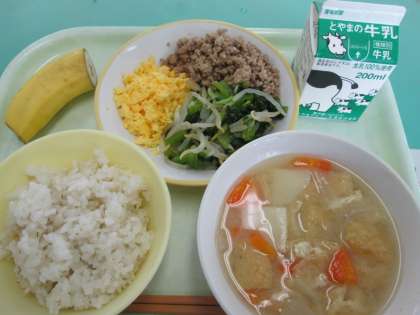 本日の献立は、二色丼、おひたし、みそ汁、バナナです。