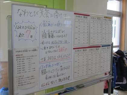 玄関には17日に予定されている「縄跳び大会」の掲示板が登場しました。今年は、チャレンジタイムができないために今ひとつ盛り上がっていないようですが、残り1週間「なりたい自分」に向けて挑戦して欲しいです。