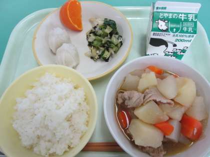 今日の献立は、ごはん、牛乳、じゃがいもの中華煮、えびパオツ、磯和え、甘平 です。