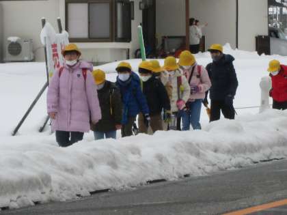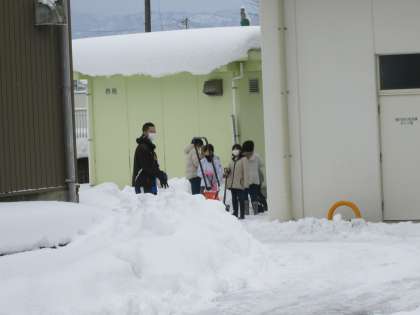雪をかき分け、滑らないように気を付けて子供たちが登校する19日(金)の朝です。