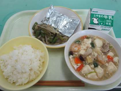 今日の献立は、ご飯、牛乳、さばの銀紙焼き、茎わかめのきんぴら、えびと野菜のうま煮 です。