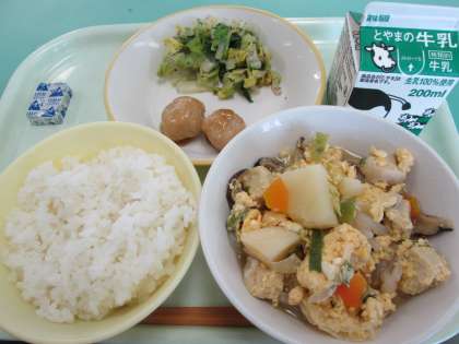 本日の献立は、白ねぎと高野豆腐の卵とじ、肉だんごのあんからめ、梅肉和え、ポケットチーズです。