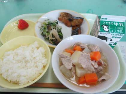 本日の献立は、鰺のみりん焼き、小松菜としめじのおひたし、大根のみそ煮込み、いちごです。