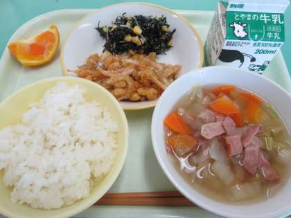 本日の献立は、大豆と白えびのかりかり揚げ、ひじきのごま和え、白菜スープ、デコポンです。
