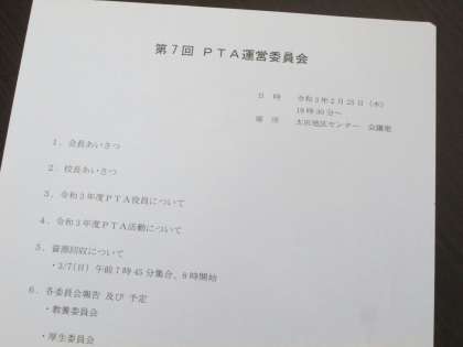 また、昨晩PTA運営委員会が行われ、次年度役員との引き継ぎ等が行われました。少しずつ次年度へ動き出しています。なお、7日に資源回収を行いますので、ご協力をお願いいたします。