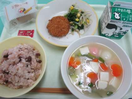 今日の献立は、赤飯、牛乳、メンチカツ、コーン和え、紅白白玉汁、お祝いデザート(シフォンケーキ) です。