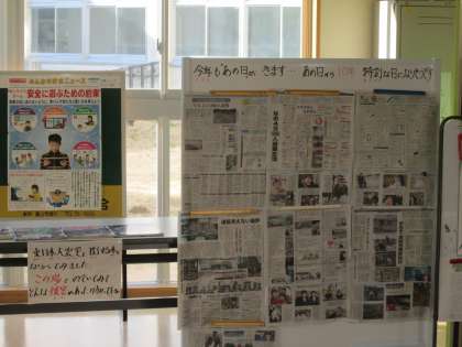 玄関に「東日本大震災10年目」に関するコーナーを設置しています。「僕、まだ生まれていなかった」という2年生の声にもあるように、6年生でも2歳のときの出来事です。しかし、知ること、思いを共有すること、そこから学ぶこと、そしてそれをつなぐことはできます。